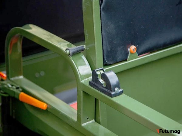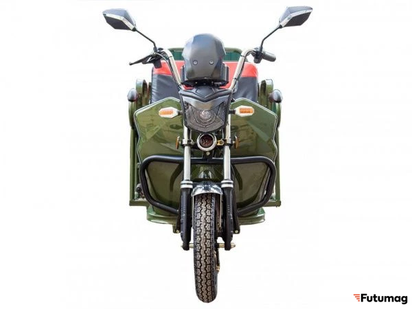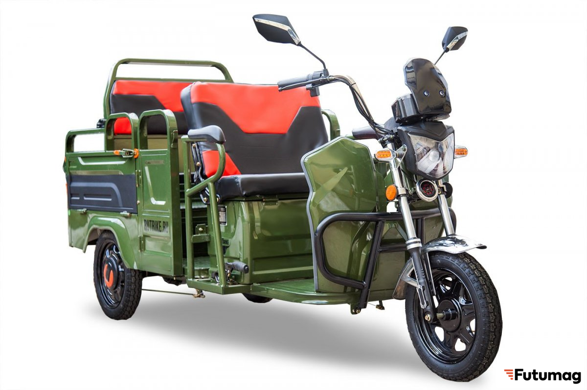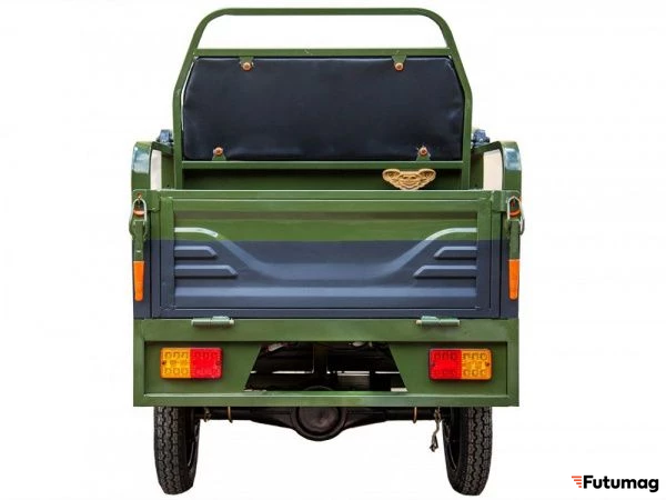 Освещение спереди и сзади гарантирует хорошую видимость в темное время суток, что делает его безопасным для эксплуатации. Кабина и крыша отсутствуют, что позволяет использовать трцикл для различных типов грузов и пассажиров.