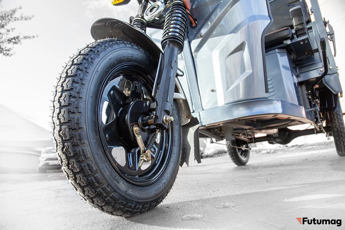 Электротрицикл оснащен гидравлическими амортизаторами усиленными на передней подвеске и рессорами (4 листа) на задней, что обеспечивает плавный ход и комфортную езду даже на неровных дорогах. Это особенно важно для длительных поездок, обеспечивая удобство для водителя и минимизируя усталость.