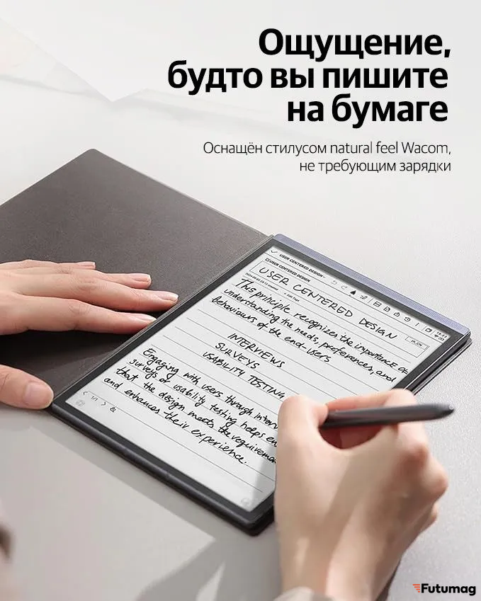 Вторая ипостась устройства — это интеллектуальный цифровой блокнот. Используя поставляемый в комплекте пассивный стилус (не требующий зарядки), пользователь может делать рукописные заметки с тактильными ощущениями, максимально близкими к письму на высококачественной бумаге. Далее в действие вступает ИИ: он распознаёт почерк и конвертирует рукописный текст в аккуратный печатный. Это решает главную проблему бумажных записей — невозможность быстрого поиска. Вы можете найти любую заметку по ключевому слову или фразе, как если бы искали в цифровом документе.