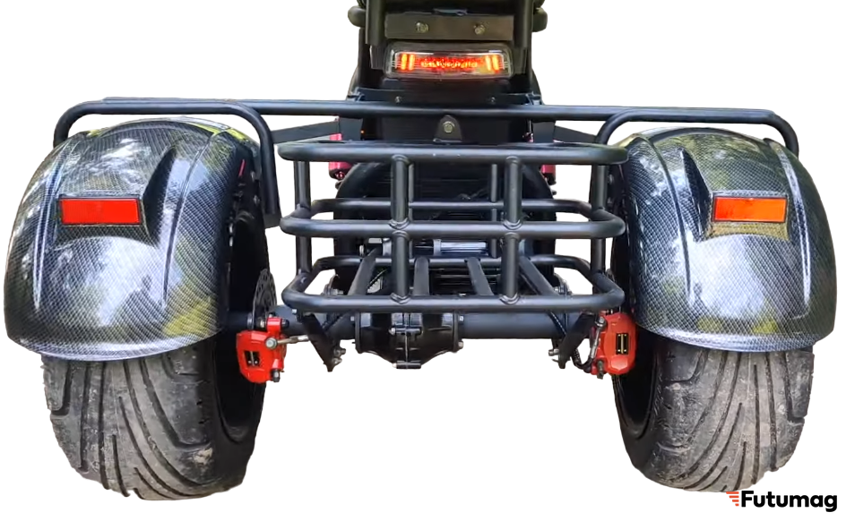 Скутер имеет триколесную конструкцию с широкими надувными колесами диаметром 6 дюймов, что обеспечивает стабильность и комфорт при движении. Передняя и задняя амортизация позволяют смягчить удары при движении по неровной местности.