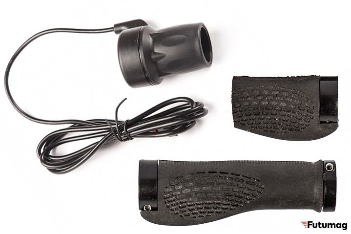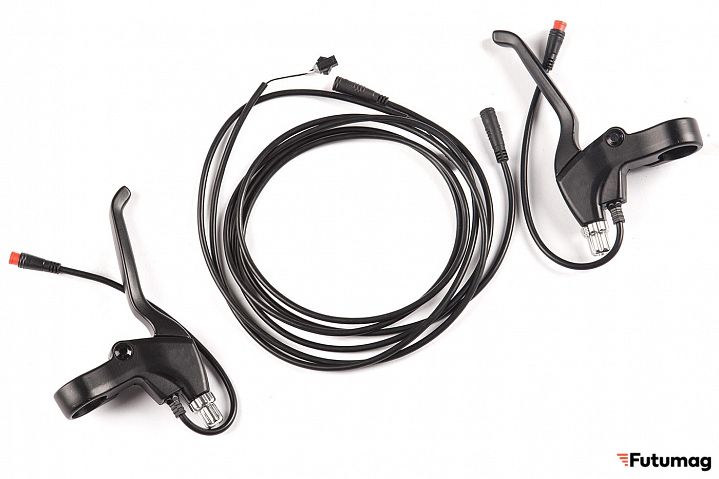 Две ручки тормоза, идущие в комплекте, снабжены концевиками, которые отключают электромотор при торможении.