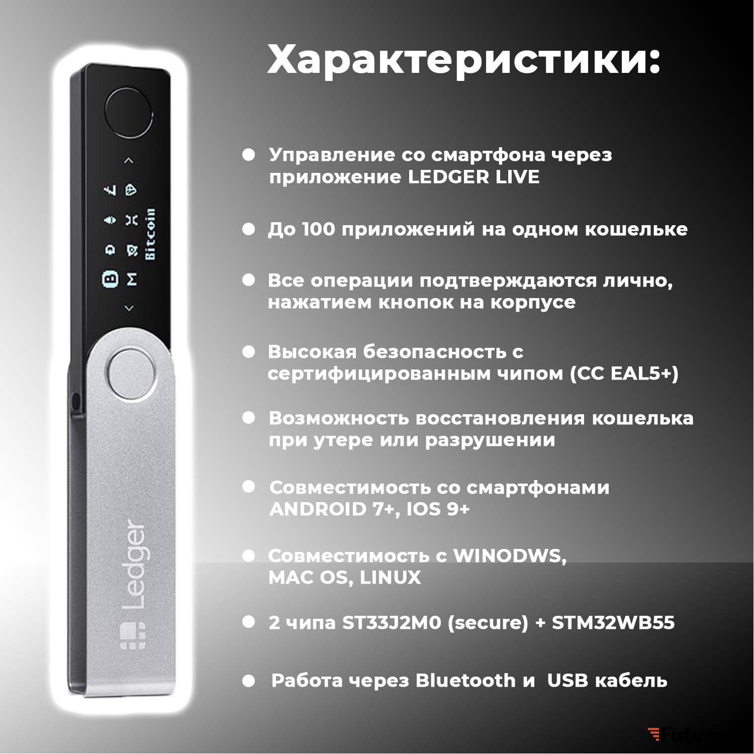 Благодаря мобильному приложению Ledger Live для iOS и Android, с устройством удобно работать через смартфон. Вы также сможете подключить криптокошелек к своему компьютеру через USB — есть версии Ledger Live для Windows, macOS и Linux.
