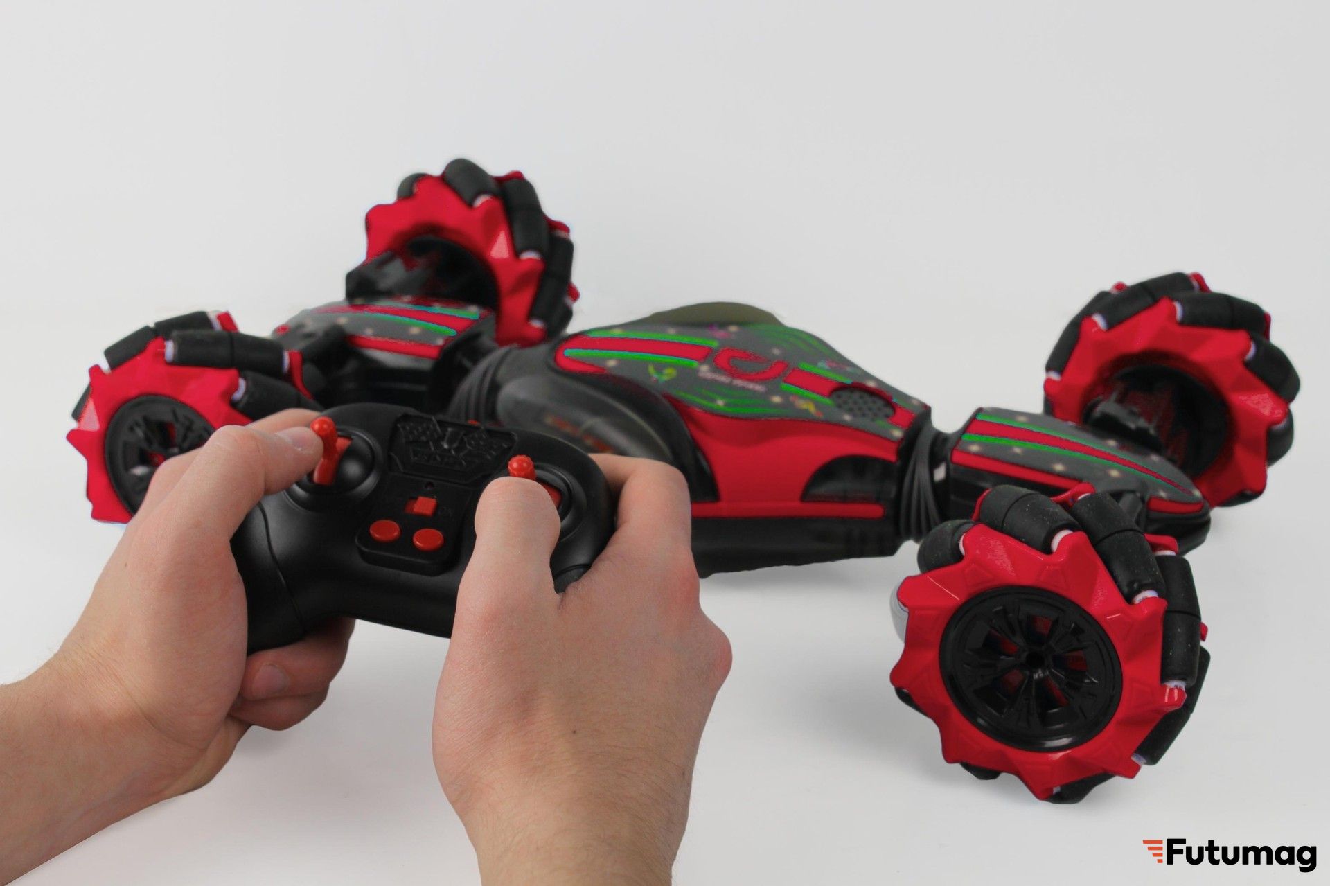 Изменение положения руки приводит в движение радиоуправляемую трюковую машинку-перевертыш. - Пульт радиоуправления - стандартный вид дистанционного управления радиоуправляемых детских дрифт-машин с джойстиком вперёд/назад, вправо/влево, демо-режимом, переключение положения твист.