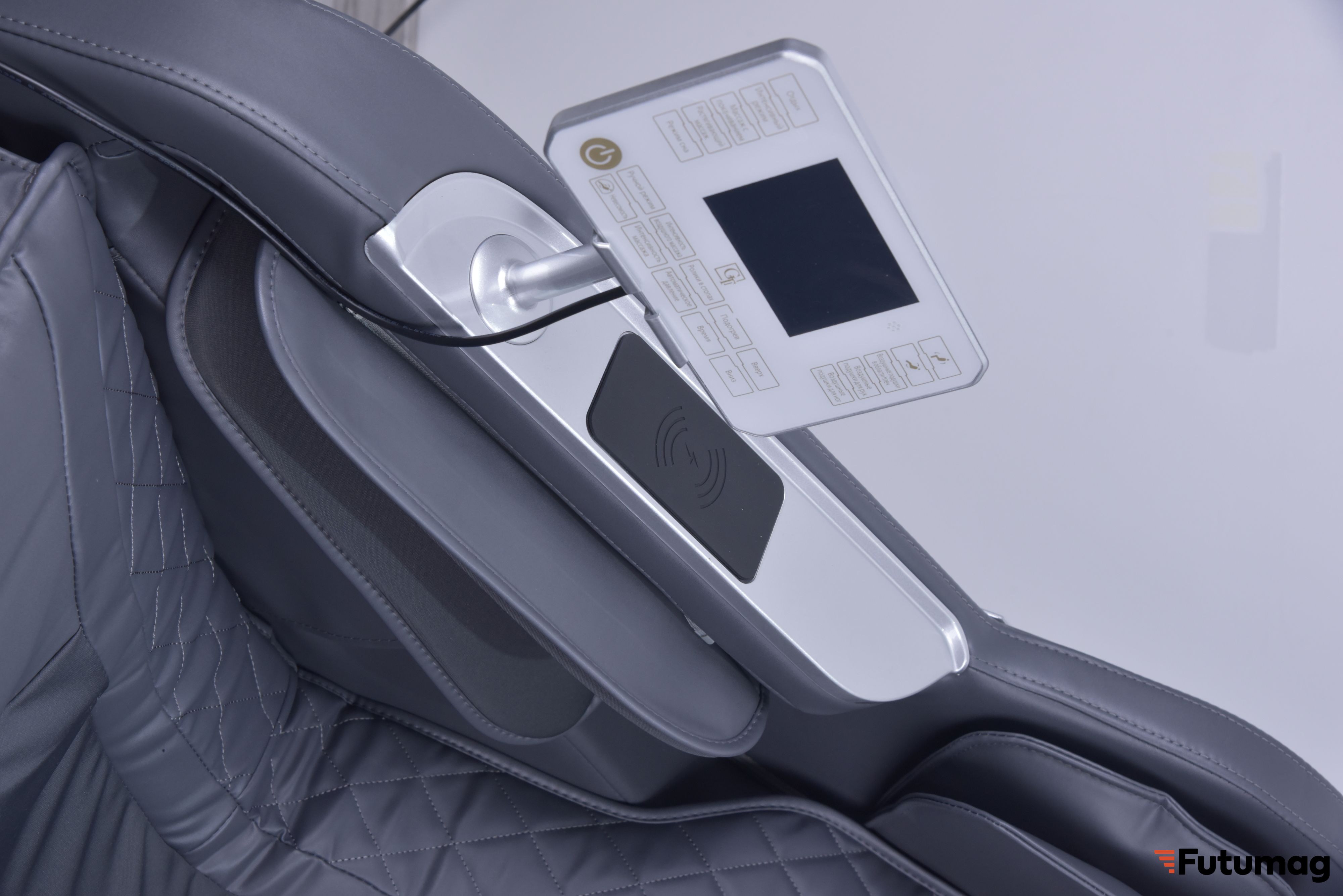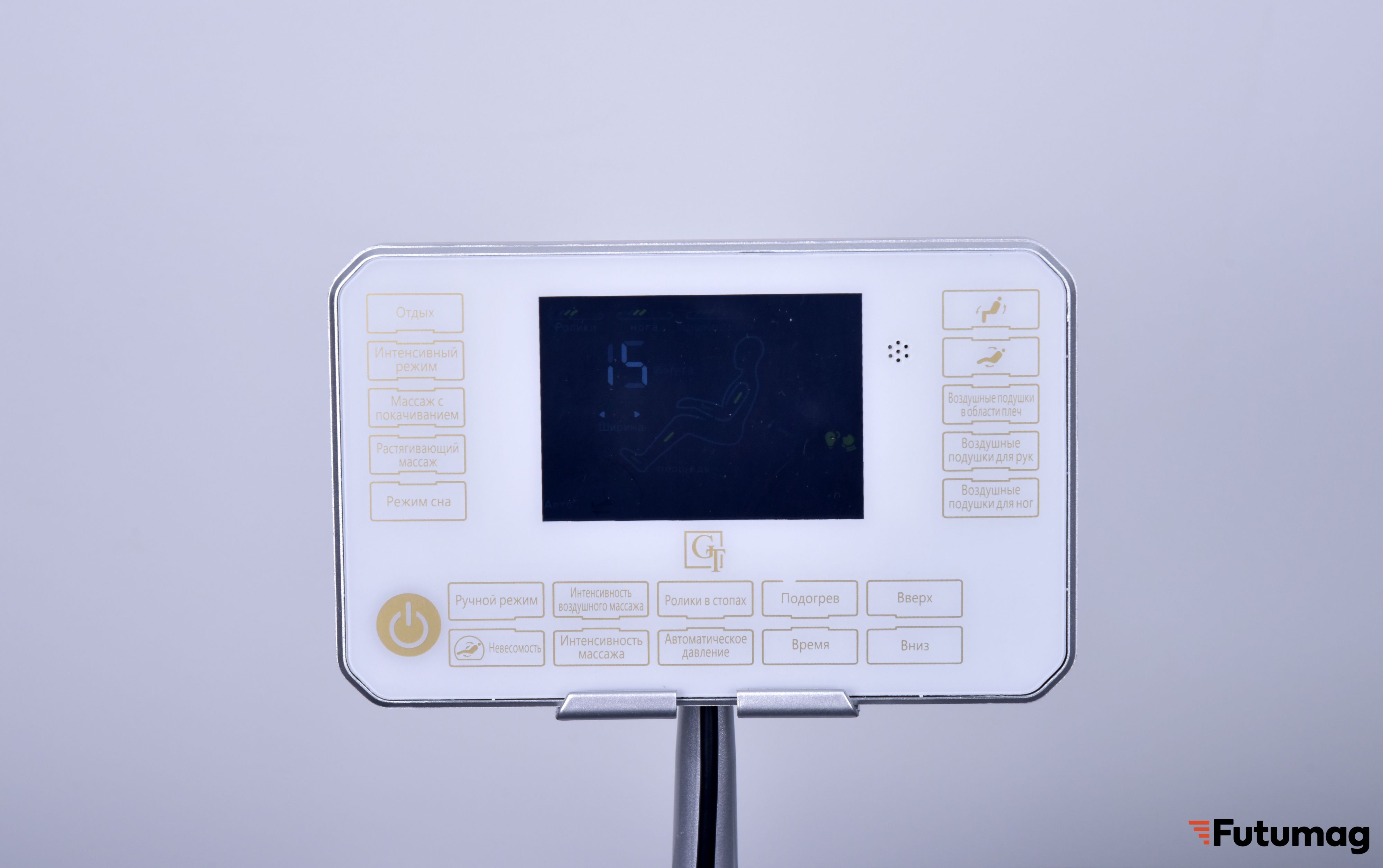 Кресло GT K35 оборудовано подлокотниками с быстрыми клавишами для управления функциями, а также функцией беспроводной зарядки для вашего мобильного устройства. Большой 7-дюймовый ЖК-экран и сенсорное управление делают настройку массажа простой и интуитивно понятной.