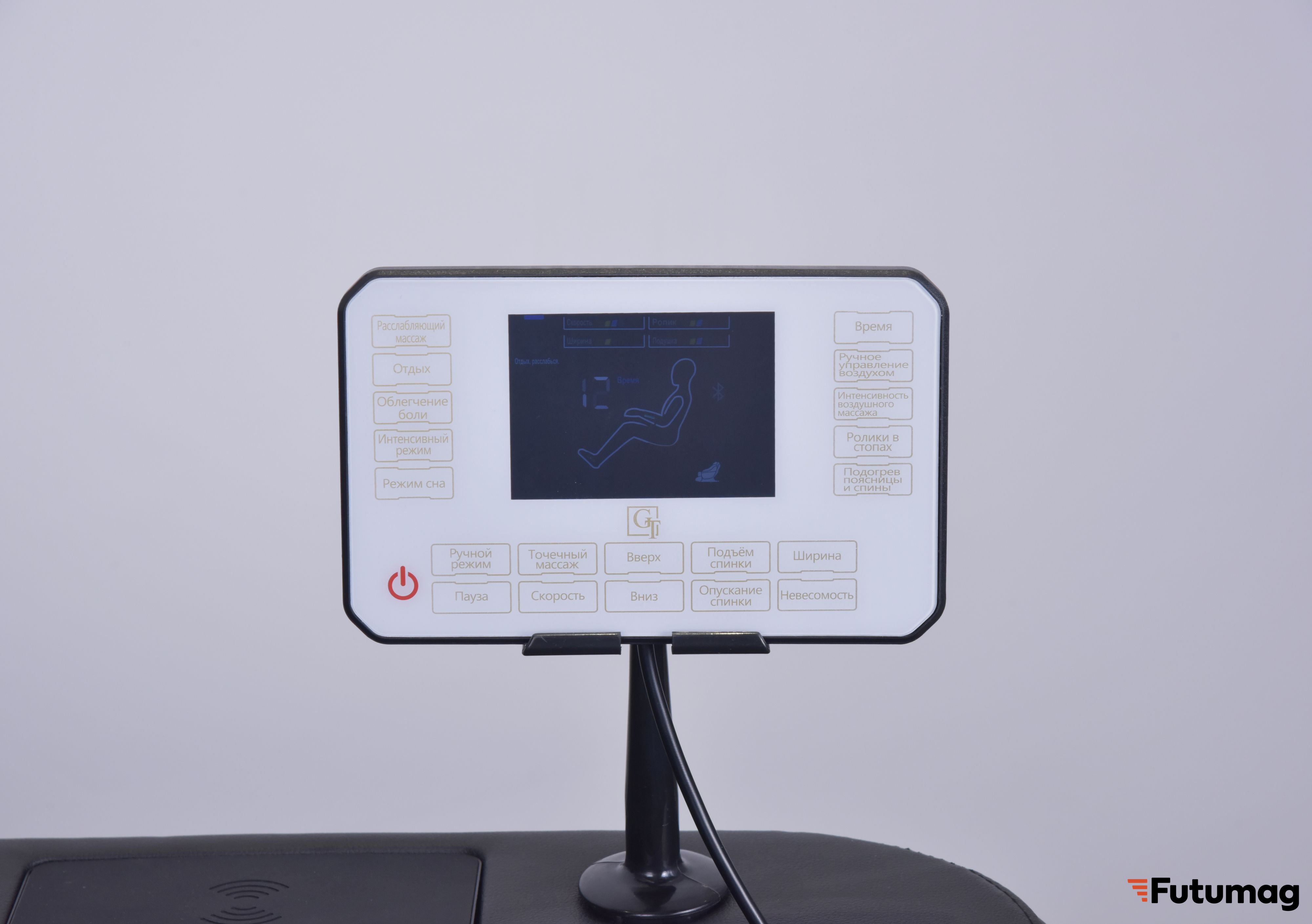 Большой 7-дюймовый ЖК-экран и сенсорное управление делают использование кресла простым и интуитивно понятным. Bluetooth-соединение позволяет вам подключать смартфон и наслаждаться музыкой через встроенные динамики с объемным стереозвучанием.