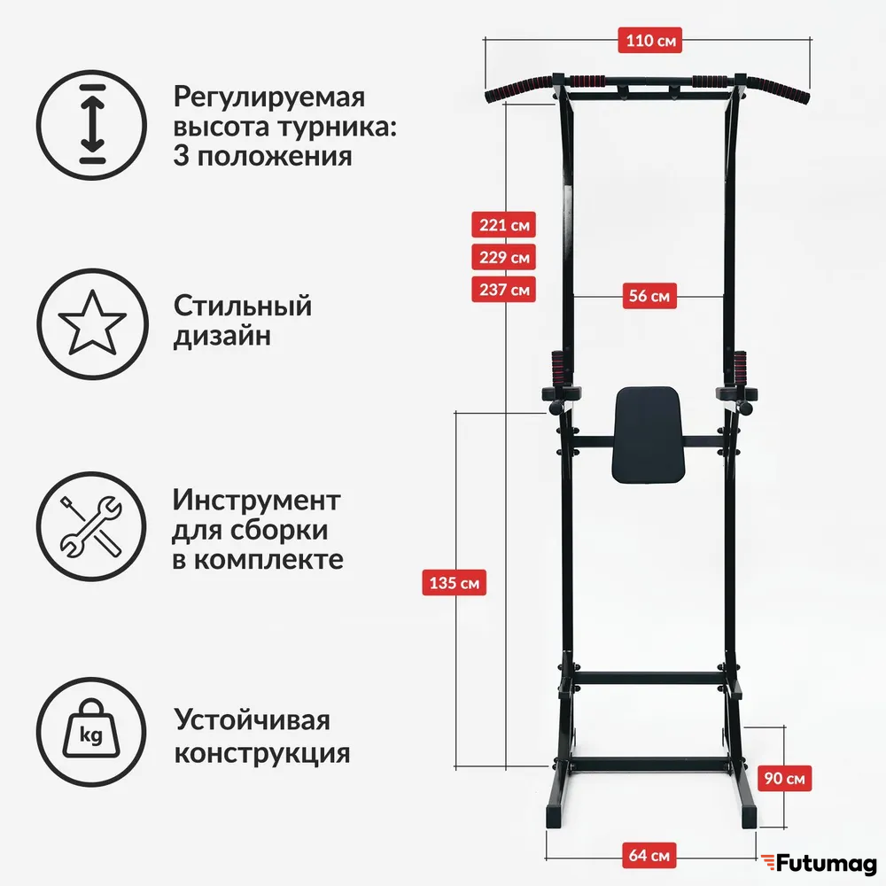 Универсальный напольный комплекс, который не требует крепления ни к полу, ни к стенам. Легко и просто передвинуть при перестановке, нет необходимости портить стены сверлением отверстий. Занимает минимум места в пространстве помещения, при этом комплекс сочетает в себе сразу несколько самых необходимых снарядов.
