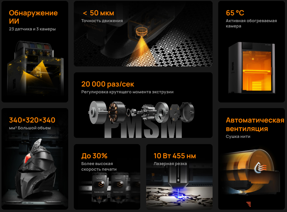 БрендBambu LabТехнология печатиМоделирование методом послойного осажденияШассиАлюминий, сталь, пластик, стеклоХотэндВсе металлическиеШестерня экструдераЗакаленная стальСоплоЗакаленная стальМакс. температура сопла350 °CПоддерживаемый диаметр сопла0.2 мм, 0.4 мм, 0.6 мм, 0.8 ммРезак для нитиВстроенныйДиаметр нити1.75 ммМакс. температура нагревательного слоя120 °CМакс. скорость инструментальной головки1000 мм/сМакс. ускорение инструментальной головки20000 мм/с2Макс. расход для Hotend40 мм3/сMax Flow для Hotend65 мм3/сАктивный нагрев камерыестьМаксимальная температура65 °CСтепень предварительной фильтрацииГ3Качество фильтра НЕРАН12Фильтрация твердых частицестьВентилятор охлаждения деталиЗамкнутый контур управленияВентилятор охлаждения для HotendЗамкнутый контур управленияВентилятор главной платы управленияЗамкнутый контур управленияВытяжной вентилятор камерыЗамкнутый контур управленияВентилятор циркуляции тепла в камереЗамкнутый контур управленияВентилятор охлаждения вспомогательной деталиЗамкнутый контур управленияПоддерживаемая нитьPLA, PETG, TPU, PVA, BVOH, ABS, ASA, PC, PA, PET, PPSКамера с видом в реальном времениестьКамера инструментальной головкиестьКамера BirdEyeестьДатчик двериПоддерживаетсяДатчик окончания нитиПоддерживаетсяДатчик спутывания нитиПоддерживаетсяОдометрия нитиПоддерживаетсяВосстановление после потери мощностиПоддерживаетсяМакс. мощность2050 ВтВстроенная память8 ГБТип лазераПолупроводниковый лазерМощность лазера10 ВтРазмер лазерного пятна0.03*0.14 мм2Макс. скорость гравировки400 мм/сМакс. толщина резки5 ммМетод позиционирования XYВизуальное позиционированиеМетод измерения высоты ZМикро-лидарОбнаружение пламениПоддерживаетсяОпределение температурыПоддерживаетсяПоддерживаемый тип изображенияРастровые и векторные изображенияПоддерживаемый тип пера10.5 мм - 12.5 ммТип лезвия45°*0.35 ммОпределение типа коврика для резкиПоддерживаетсяВес30 кг -
