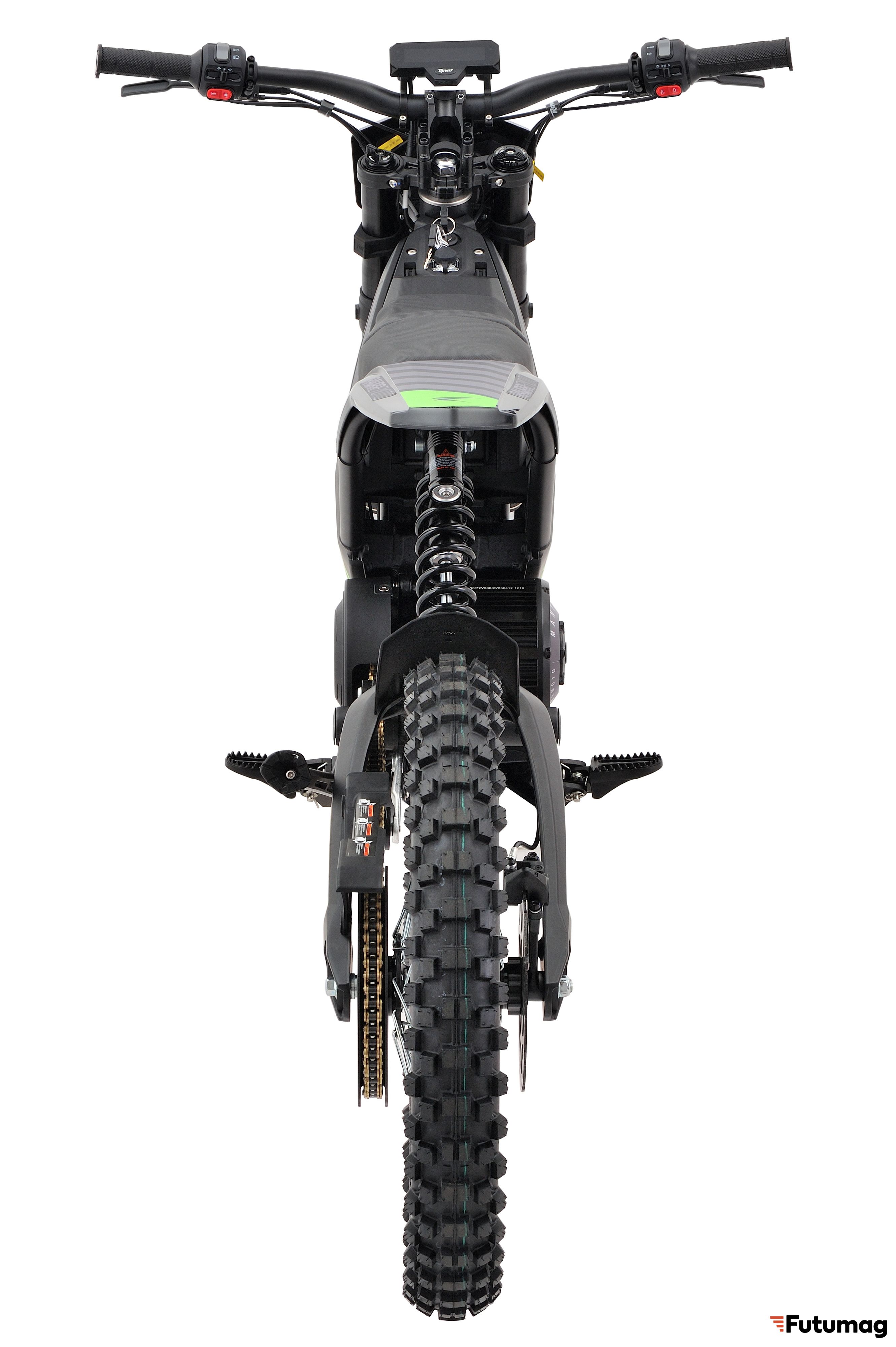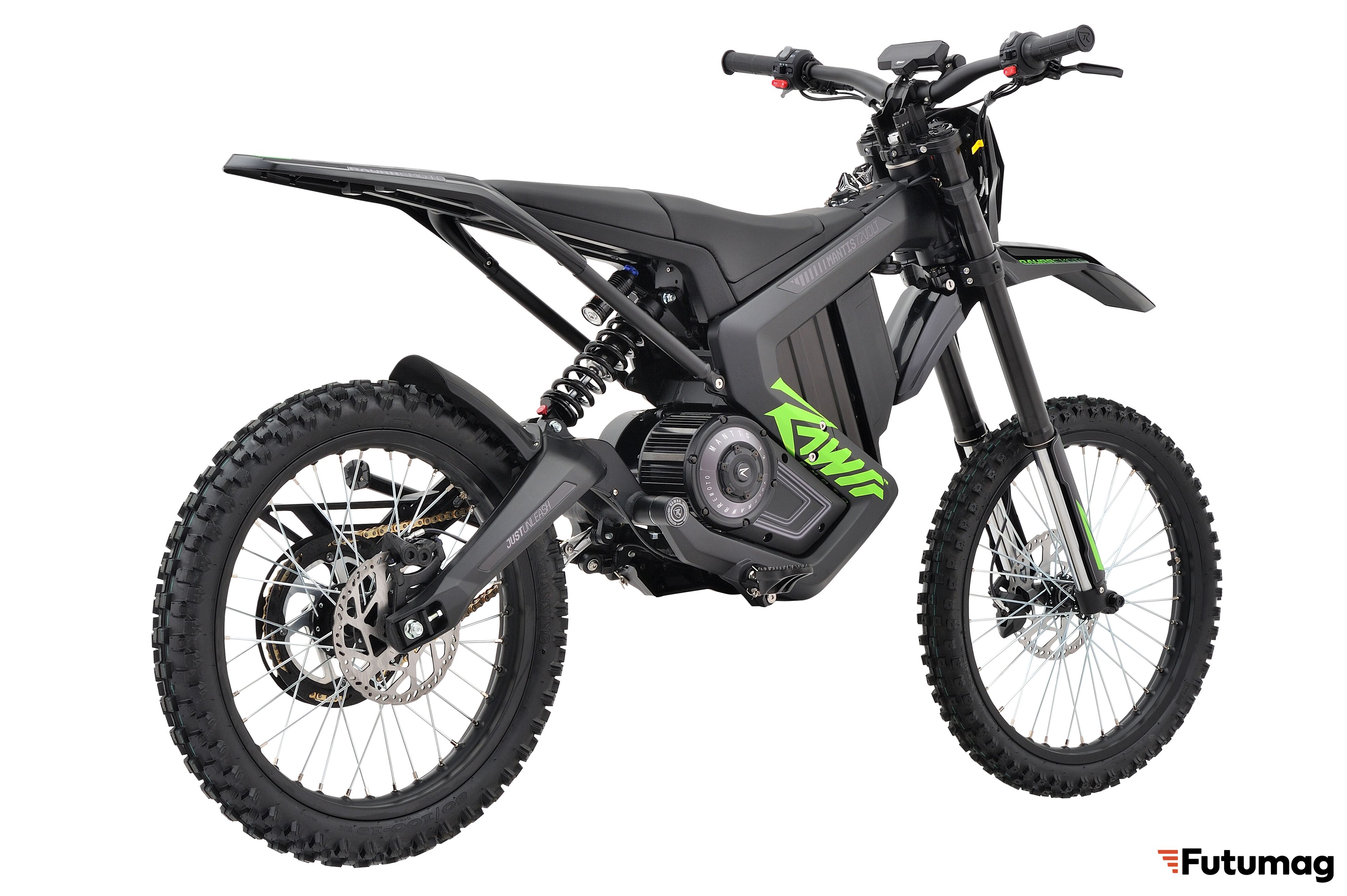 Электромотоцикл оснащен гидравлическими дисковыми тормозами с передним и задним тормозными дисками диаметром 203 мм, что обеспечивает надежное торможение. Контроллер Mantis FOC Controller обеспечивает высокую производительность и эффективность.