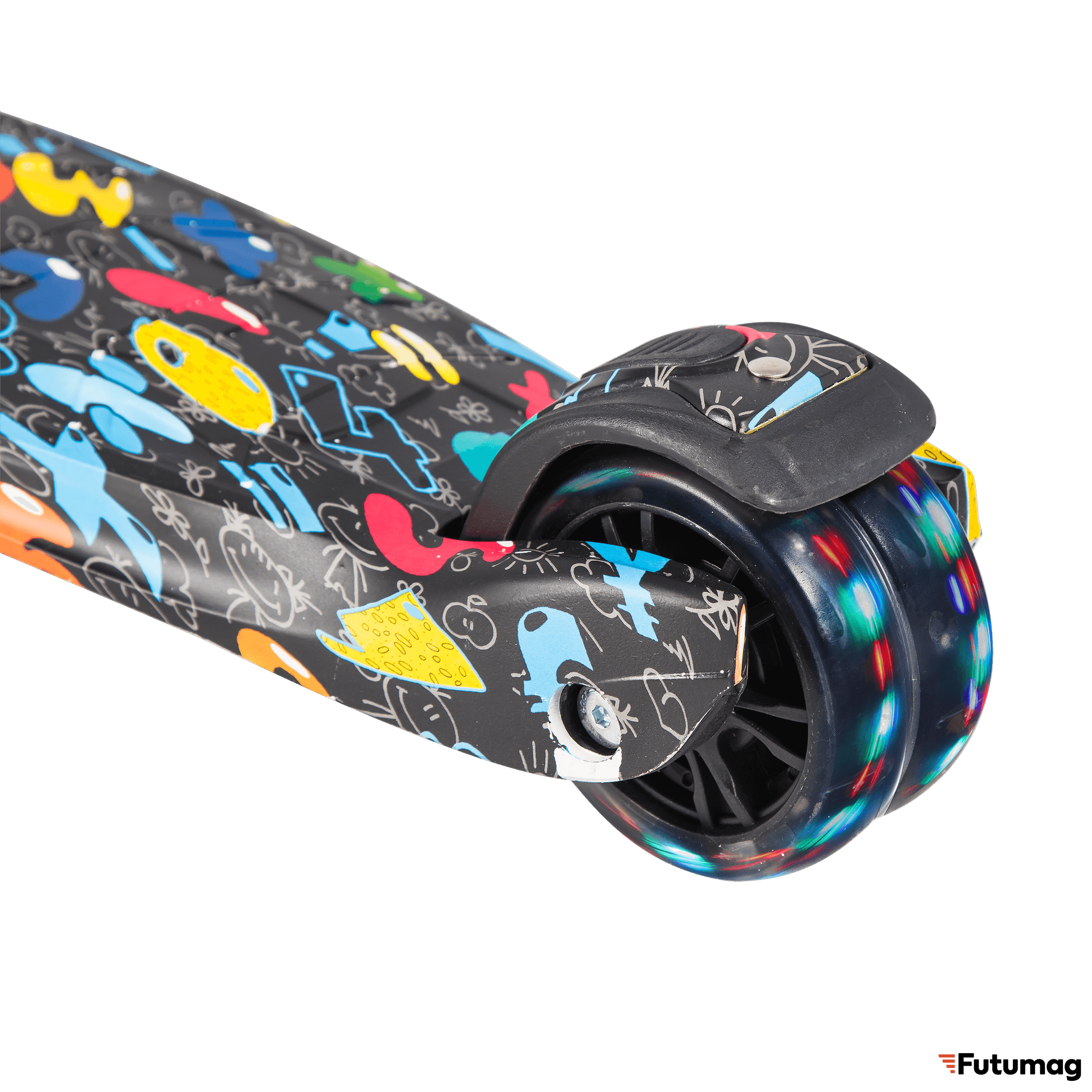 Колеса самоката выполнены из прочной пластмассы со специальным полиуретановым покрытием, обеспечивающим в совокупности с подшипниками стандарта ABEC 9, хорошие накат и амортизацию. Размер передних колес 135х36 мм, заднего (сдвоенного) - 90х48 мм. Заднее сдвоенное колесо оснащено крылом-тормозом. Все колеса самоката имеют так любимую детьми светодиодную подсветку, которая запускается при движении.