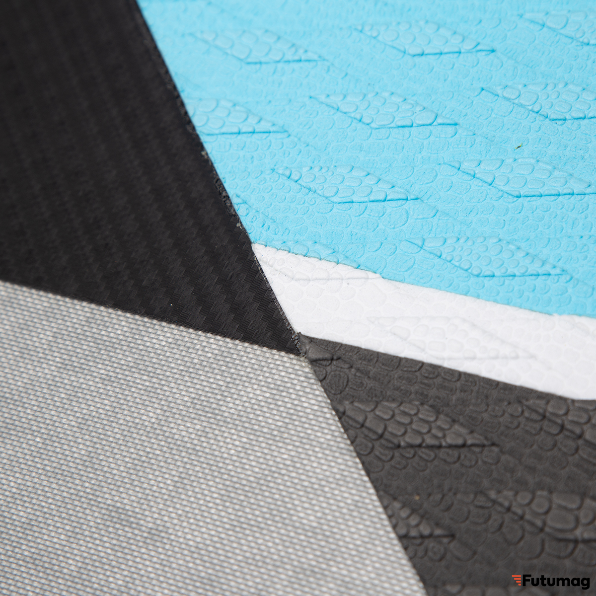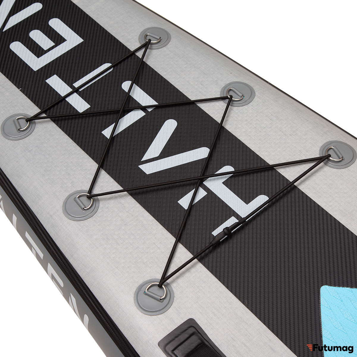 Толщина 15 сантиметров (6 дюймов) является стандартной для надувных сапбордов и обеспечивает необходимую жесткость при рабочем давлении. Узкий корпус при стандартной толщине создает увеличенное отношение глубины к ширине, что улучшает прорезание волны и повышает устойчивость на курсе при боковом ветре. Форма носа заострена для лучшего захода на волну и снижения брызгообразования.