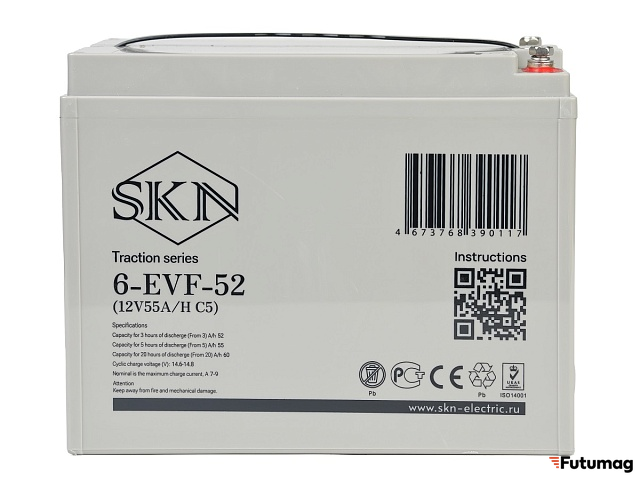 SKN 6-EVF-52 выполнен по технологии AGM VRLA, что обеспечивает его необслуживаемость и защиту от утечек электролита. Эта технология позволяет аккумулятору сохранять свои характеристики даже в условиях интенсивного использования. Отсутствие необходимости в обслуживании значительно упрощает эксплуатацию и делает его удобным для пользователей.