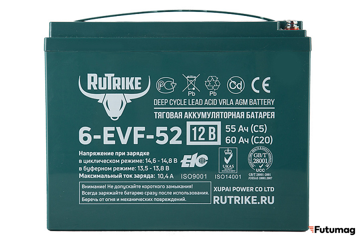 RuTrike 6-EVF-52 изготовлен с использованием экологически чистых запатентованных сплавов, не содержащих кадмия и мышьяка. Увеличенная толщина свинцовых пластин и плотный сепаратор из углеволокна, пропитанный электролитом по технологии NANO GEL, обеспечивают отличную проводимость и предотвращают утечки. Это позволяет аккумулятору работать эффективно и долго, не требуя долива воды на протяжении всего срока службы.