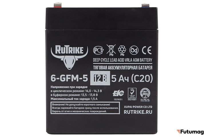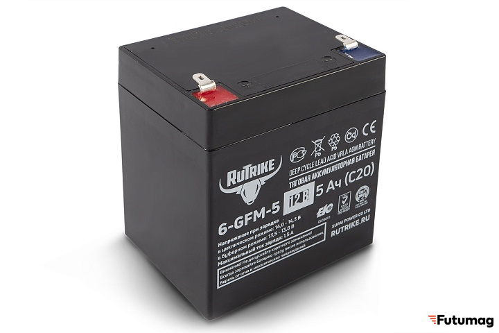 Аккумулятор RuTrike 6-GFM-5 обладает ёмкостью 5 A/h при 20-часовом разряде (С20), что обеспечивает стабильную работу в различных условиях. Напряжение в буферном режиме составляет 13,6 V, а в циклическом режиме — 14,1 V. Номинальный ток заряда достигает 1,5 A, что позволяет быстро восстанавливать уровень заряда без риска повреждения устройства.