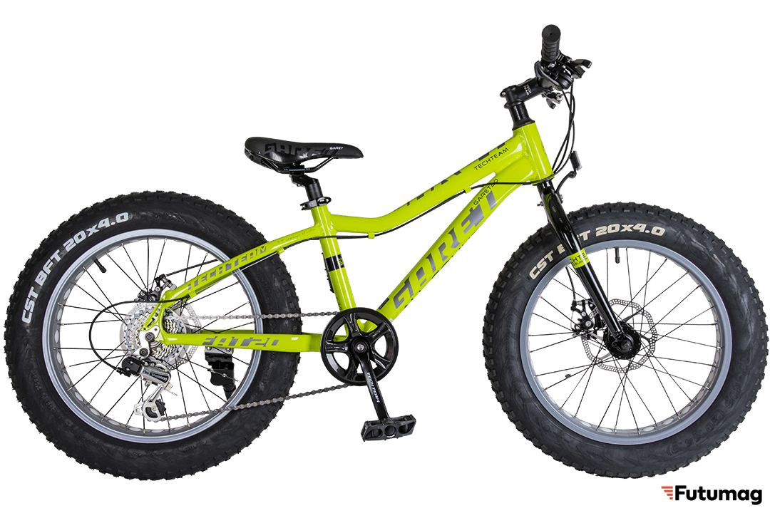 У нас есть не только фэтбайки для взрослых, но и для подрастающего поколения, один из них – TT Garet 20 2021 года выпуска. Его лёгкая, но прочная алюминиевая рама имеет размер 13 дюймов, она предназначена для подростков ростом 130-145 см. Для них же она выпускается в двух весёлых расцветках – сине-оранжевой и салатовой. Это ригид, вилка здесь жёсткая. Сталь, из которой она изготовлена, несколько смягчает вибрации от дорожных неровностей, а помогает ей добиться в этом ещё больших успехов эргономическое седло.