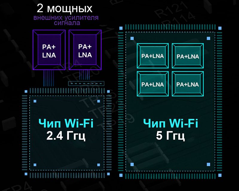 Для сигнала частотой 2.4 Ггц используются два мощных внешних усилителя (PA) и чувствительный усилитель с низким уровнем шума (LNA) для приема. Для сигнала частотой 5 Ггц используются 4 усилителя и отдельный высокочувствительный ресивер, за счет чего повышается диапазон приема сигнала и его устойчивость к препятствиям, позволяя роутеру Redmi работать даже в сложных условиях.